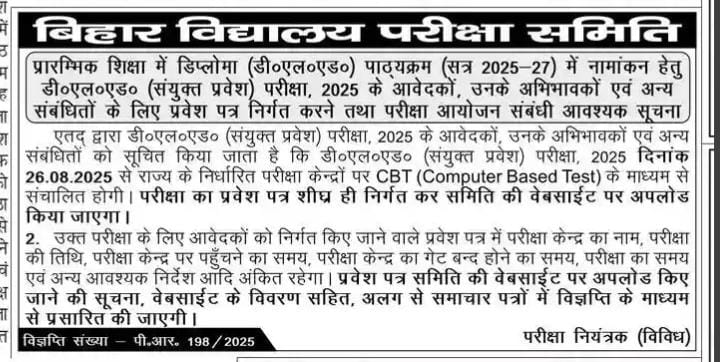Bihar D.El.Ed 2025 Bihar School Examination Board (BSEB) ने Diploma in Elementary Education (D.El.Ed) Joint Entrance Exam 2025-27 के लिए official notice जारी कर दिया है। इस परीक्षा में वे सभी उम्मीदवार शामिल होंगे जिन्होंने आवेदन किया था। अब BSEB ने exam date, admit card और परीक्षा से जुड़ी जरूरी जानकारी शेयर की है।